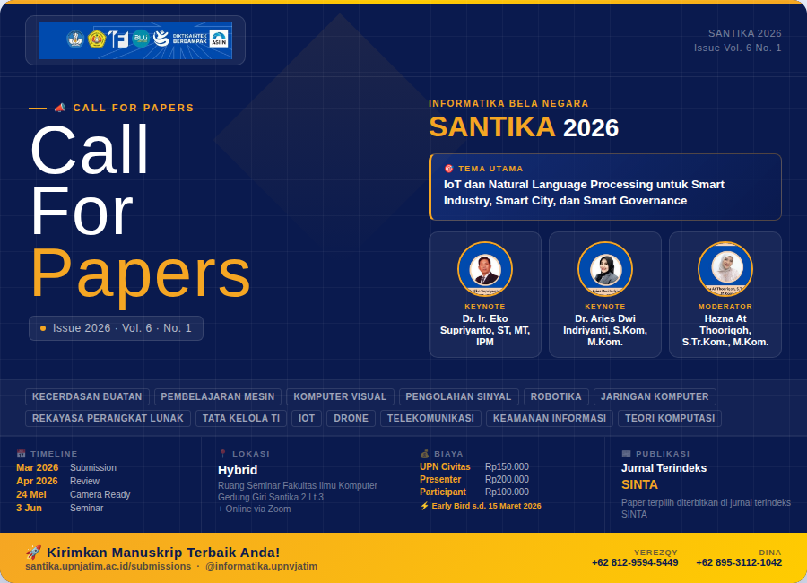 Program Studi Informatika UPN “Veteran” Jawa Timur kembali menyelenggarakan SANTIKA (Seminar Nasional Informatika Bela Negara) 2026, sebuah forum ilmiah bergengsi yang menjadi wadah publikasi bagi para peneliti, akademisi, mahasiswa, dan praktisi di bidang informatika dan teknologi informasi.
