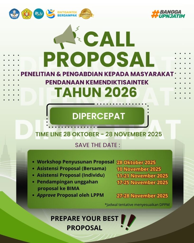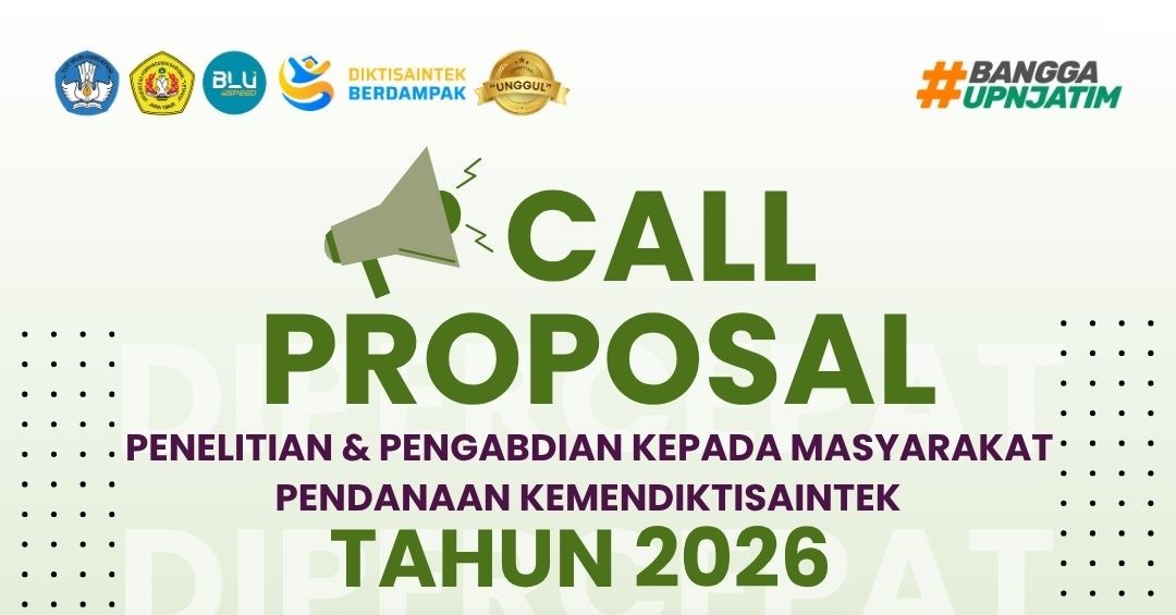Lembaga Penelitian dan Pengabdian kepada Masyarakat (LPPM) UPN “Veteran” Jawa Timur membuka Call for Proposal untuk skema Penelitian dan Pengabdian kepada Masyarakat Pendanaan Kemendikbudristek Tahun 2026.