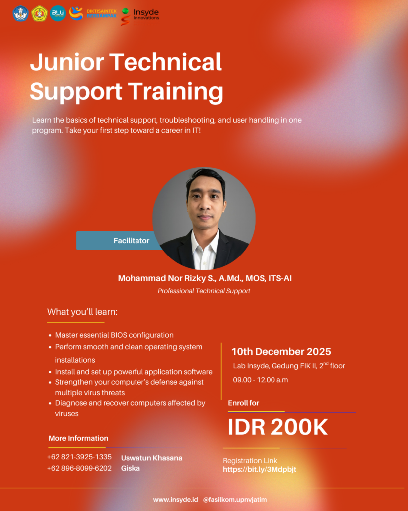 Insyde Innovations bersama Fakultas Ilmu Komputer UPN “Veteran” Jawa Timur menggelar pelatihan Junior Technical Support Training, sebuah program komprehensif yang dirancang untuk membekali peserta dengan keterampilan dasar dalam technical support, troubleshooting, serta penanganan pengguna. Pelatihan ini menjadi langkah awal ideal bagi siapa pun yang ingin memulai karier di bidang IT.