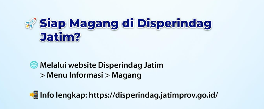 Dinas Perindustrian dan Perdagangan Provinsi Jawa Timur (Disperindag Jatim) membuka kesempatan magang/Praktik Kerja Lapangan (PKL) untuk mahasiswa yang tertarik mendapatkan pengalaman kerja langsung di lingkungan pemerintahan bidang industri dan perdagangan.