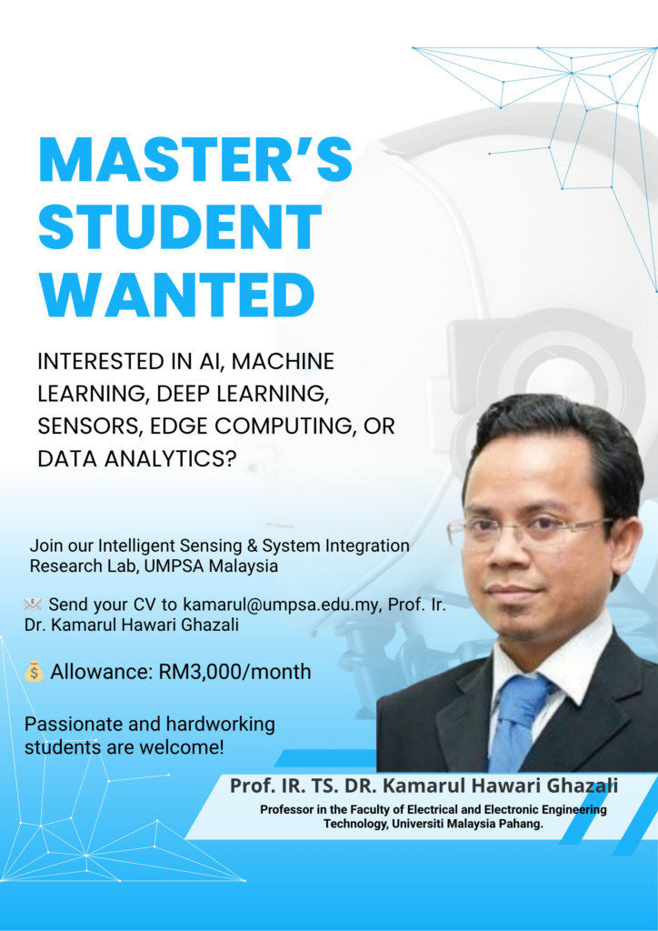 Tersedia kesempatan untuk bergabung dalam program magister riset di Universiti Malaysia Pahang Al-Sultan Abdullah (UMPSA) bagi mahasiswa yang memiliki minat pada bidang Artificial Intelligence (AI), Machine Learning, Deep Learning, Sensors, Edge Computing, dan Data Analytics.