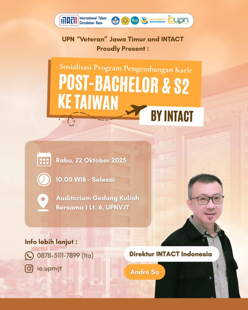 UPN “Veteran” Jawa Timur melalui Kantor Internasional dan Sekretariat Eksekutif mengundang seluruh mahasiswa untuk hadir dalam kegiatan Sosialisasi Studi Lanjut Taiwan yang diselenggarakan oleh International Talent Circulation Base (ITCB) Taiwan–Indonesia.