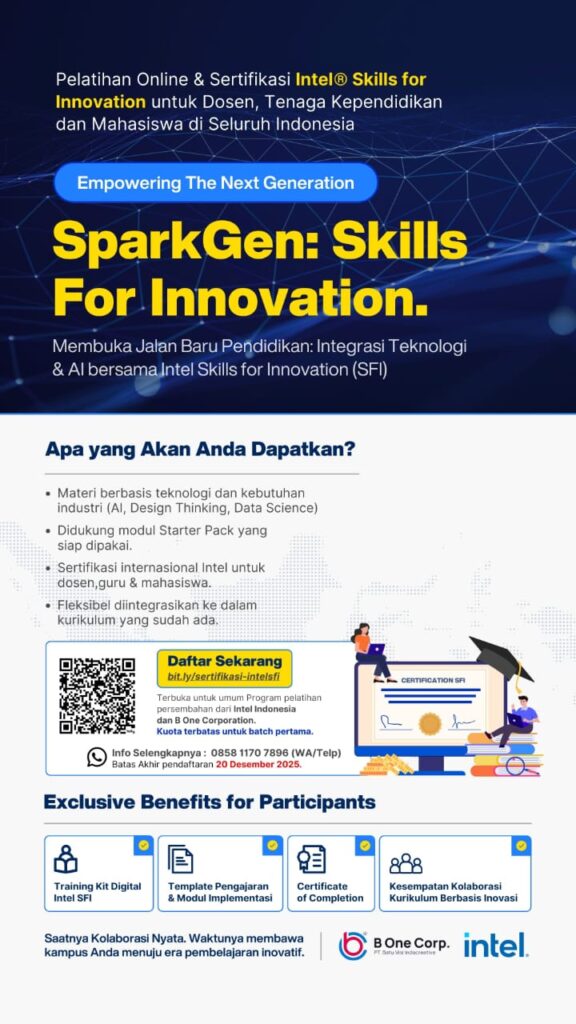 Program Intel® Skills for Innovation (SFI) merupakan inisiatif global Intel yang bertujuan untuk memberdayakan pendidik dan institusi pendidikan agar mampu menyiapkan generasi masa depan dengan keterampilan abad ke-21. Melalui program ini, dosen didorong untuk mengadopsi pembelajaran inovatif yang memadukan teknologi digital, pemikiran komputasional, dan pemecahan masalah nyata.