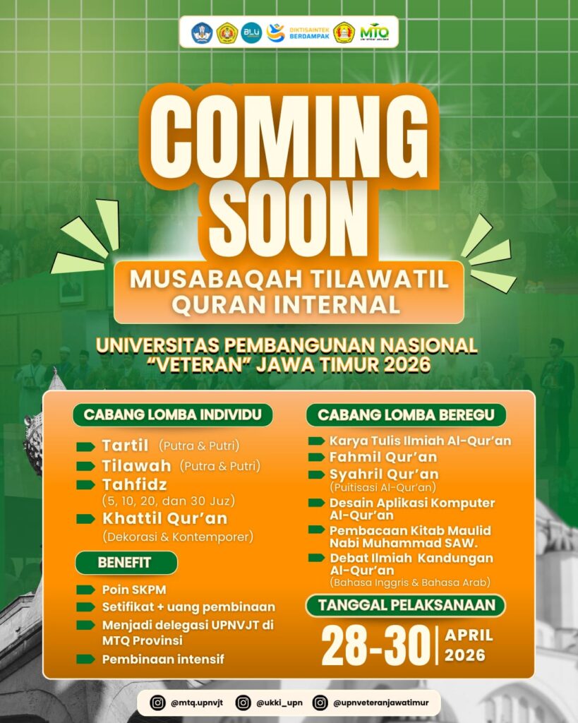 Universitas Pembangunan Nasional “Veteran” Jawa Timur (UPNVJT) akan menyelenggarakan Musabaqah Tilawatil Qur’an (MTQ) Internal Tahun 2026 sebagai wadah pengembangan potensi, bakat, dan prestasi mahasiswa dalam bidang keislaman dan Al-Qur’an. Kegiatan ini menjadi ajang seleksi internal untuk menjaring mahasiswa terbaik yang akan dipersiapkan sebagai delegasi UPNVJT pada MTQ tingkat Provinsi.